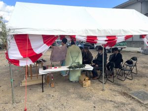 地鎮祭では、神主様による祝詞奏上のもと、厳かな雰囲気の中で式が進められました。